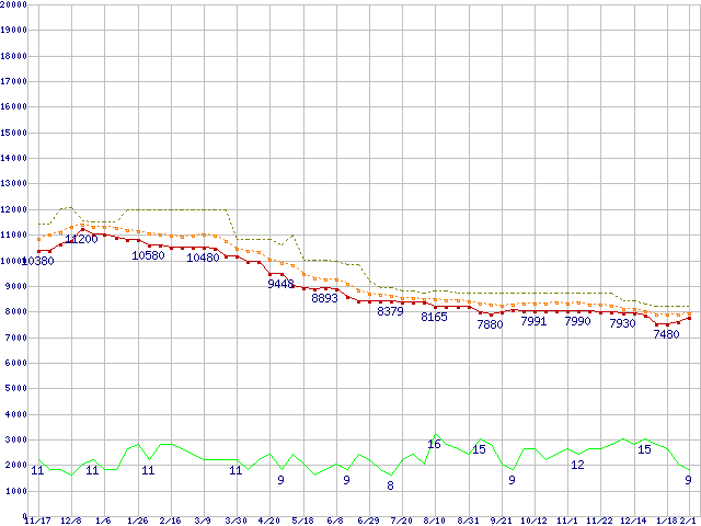 ※このグラフは過去のデータも税率5%相当に調整した税込み相当額のグラフです。 税率変更や、総額表示方式導入(2004年4月)の影響は除いています。 | | | ●凡例 | 最安値 (点線部は販売店未確認 または未調査) | 平均値 | 最高値 | ショップ数 |