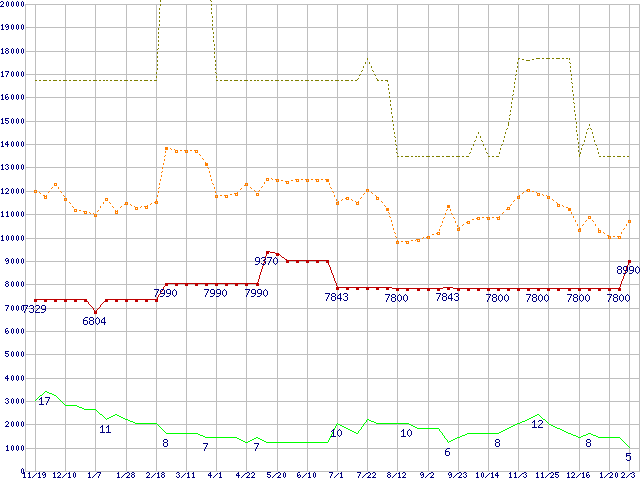 ※このグラフは過去のデータも税率5%相当に調整した税込み相当額のグラフです。 税率変更や、総額表示方式導入(2004年4月)の影響は除いています。 | | | ●凡例 | 最安値 (点線部は販売店未確認 または未調査) | 平均値 | 最高値 | ショップ数 |