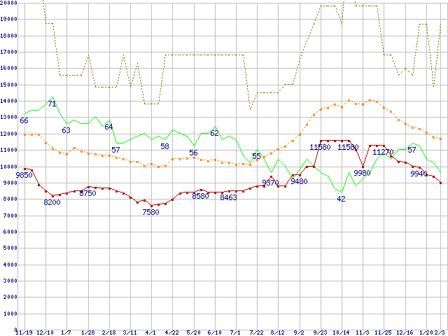 ※このグラフは過去のデータも税率5%相当に調整した税込み相当額のグラフです。 税率変更や、総額表示方式導入(2004年4月)の影響は除いています。 | | | ●凡例 | 最安値 (点線部は販売店未確認 または未調査) | 平均値 | 最高値 | ショップ数 |
