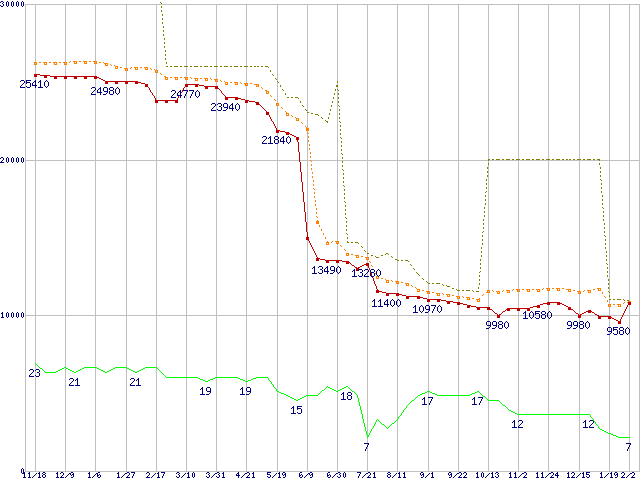 ※このグラフは過去のデータも税率5%相当に調整した税込み相当額のグラフです。 税率変更や、総額表示方式導入(2004年4月)の影響は除いています。 | | | ●凡例 | 最安値 (点線部は販売店未確認 または未調査) | 平均値 | 最高値 | ショップ数 |