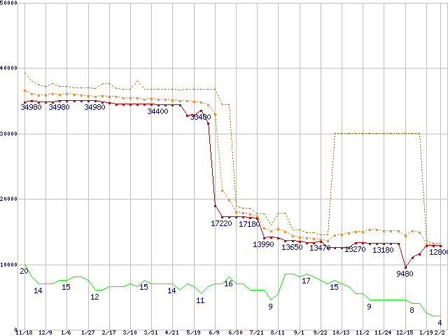 ※このグラフは過去のデータも税率5%相当に調整した税込み相当額のグラフです。 税率変更や、総額表示方式導入(2004年4月)の影響は除いています。 | | | ●凡例 | 最安値 (点線部は販売店未確認 または未調査) | 平均値 | 最高値 | ショップ数 |