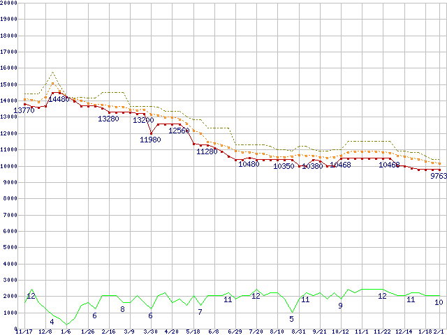 ※このグラフは過去のデータも税率5%相当に調整した税込み相当額のグラフです。 税率変更や、総額表示方式導入(2004年4月)の影響は除いています。 | | | ●凡例 | 最安値 (点線部は販売店未確認 または未調査) | 平均値 | 最高値 | ショップ数 |