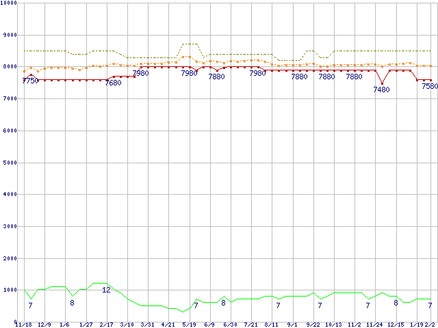 ※このグラフは過去のデータも税率5%相当に調整した税込み相当額のグラフです。 税率変更や、総額表示方式導入(2004年4月)の影響は除いています。 | | | ●凡例 | 最安値 (点線部は販売店未確認 または未調査) | 平均値 | 最高値 | ショップ数 |