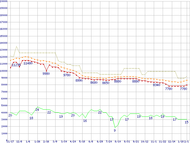 ※このグラフは過去のデータも税率5%相当に調整した税込み相当額のグラフです。 税率変更や、総額表示方式導入(2004年4月)の影響は除いています。 | | | ●凡例 | 最安値 (点線部は販売店未確認 または未調査) | 平均値 | 最高値 | ショップ数 |