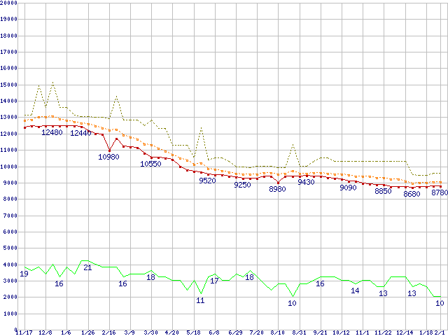 ※このグラフは過去のデータも税率5%相当に調整した税込み相当額のグラフです。 税率変更や、総額表示方式導入(2004年4月)の影響は除いています。 | | | ●凡例 | 最安値 (点線部は販売店未確認 または未調査) | 平均値 | 最高値 | ショップ数 |