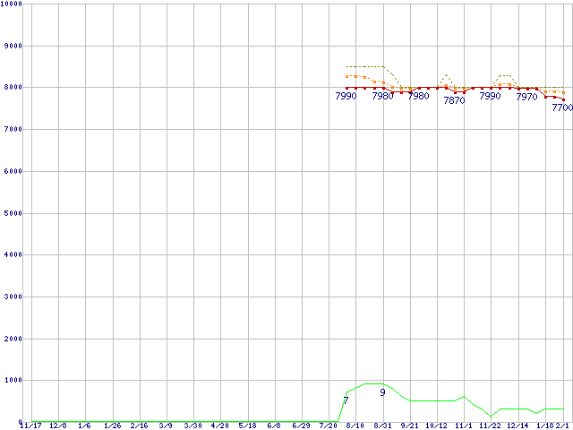 ※このグラフは過去のデータも税率5%相当に調整した税込み相当額のグラフです。 税率変更や、総額表示方式導入(2004年4月)の影響は除いています。 | | | ●凡例 | 最安値 (点線部は販売店未確認 または未調査) | 平均値 | 最高値 | ショップ数 |
