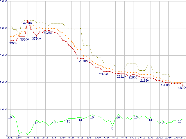 ※このグラフは過去のデータも税率5%相当に調整した税込み相当額のグラフです。 税率変更や、総額表示方式導入(2004年4月)の影響は除いています。 | | | ●凡例 | 最安値 (点線部は販売店未確認 または未調査) | 平均値 | 最高値 | ショップ数 |