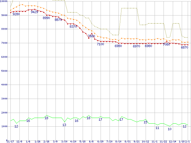 ※このグラフは過去のデータも税率5%相当に調整した税込み相当額のグラフです。 税率変更や、総額表示方式導入(2004年4月)の影響は除いています。 | | | ●凡例 | 最安値 (点線部は販売店未確認 または未調査) | 平均値 | 最高値 | ショップ数 |