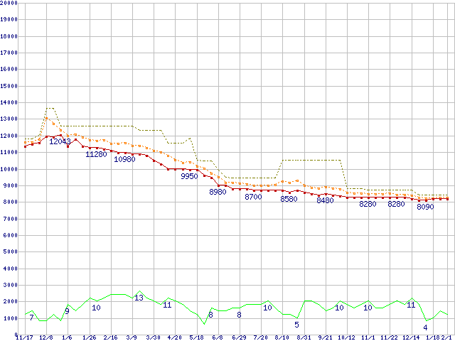 ※このグラフは過去のデータも税率5%相当に調整した税込み相当額のグラフです。 税率変更や、総額表示方式導入(2004年4月)の影響は除いています。 | | | ●凡例 | 最安値 (点線部は販売店未確認 または未調査) | 平均値 | 最高値 | ショップ数 |