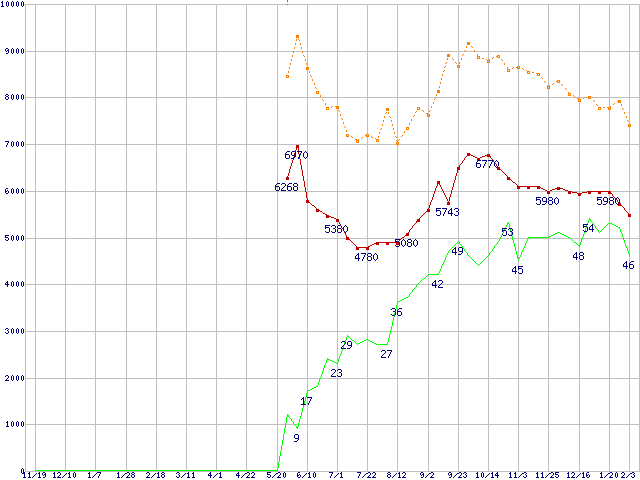 ※このグラフは過去のデータも税率5%相当に調整した税込み相当額のグラフです。 税率変更や、総額表示方式導入(2004年4月)の影響は除いています。 | | | ●凡例 | 最安値 (点線部は販売店未確認 または未調査) | 平均値 | 最高値 | ショップ数 |