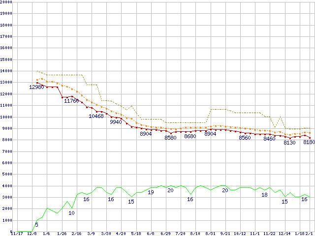 ※このグラフは過去のデータも税率5%相当に調整した税込み相当額のグラフです。 税率変更や、総額表示方式導入(2004年4月)の影響は除いています。 | | | ●凡例 | 最安値 (点線部は販売店未確認 または未調査) | 平均値 | 最高値 | ショップ数 |