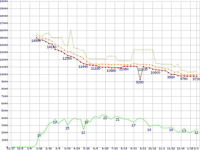 ※このグラフは過去のデータも税率5%相当に調整した税込み相当額のグラフです。 税率変更や、総額表示方式導入(2004年4月)の影響は除いています。 | | | ●凡例 | 最安値 (点線部は販売店未確認 または未調査) | 平均値 | 最高値 | ショップ数 |