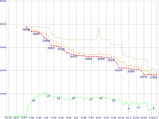 ※このグラフは過去のデータも税率5%相当に調整した税込み相当額のグラフです。 税率変更や、総額表示方式導入(2004年4月)の影響は除いています。 | | | ●凡例 | 最安値 (点線部は販売店未確認 または未調査) | 平均値 | 最高値 | ショップ数 |