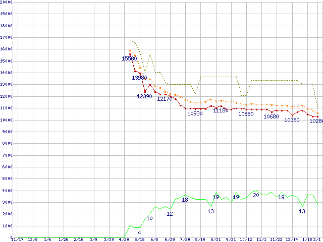 ※このグラフは過去のデータも税率5%相当に調整した税込み相当額のグラフです。 税率変更や、総額表示方式導入(2004年4月)の影響は除いています。 | | | ●凡例 | 最安値 (点線部は販売店未確認 または未調査) | 平均値 | 最高値 | ショップ数 |