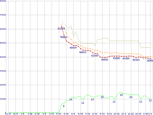※このグラフは過去のデータも税率5%相当に調整した税込み相当額のグラフです。 税率変更や、総額表示方式導入(2004年4月)の影響は除いています。 | | | ●凡例 | 最安値 (点線部は販売店未確認 または未調査) | 平均値 | 最高値 | ショップ数 |