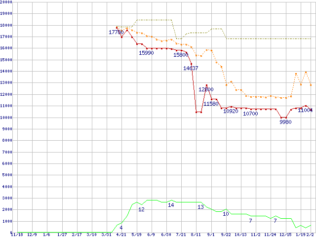 ※このグラフは過去のデータも税率5%相当に調整した税込み相当額のグラフです。 税率変更や、総額表示方式導入(2004年4月)の影響は除いています。 | | | ●凡例 | 最安値 (点線部は販売店未確認 または未調査) | 平均値 | 最高値 | ショップ数 |