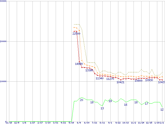 ※このグラフは過去のデータも税率5%相当に調整した税込み相当額のグラフです。 税率変更や、総額表示方式導入(2004年4月)の影響は除いています。 | | | ●凡例 | 最安値 (点線部は販売店未確認 または未調査) | 平均値 | 最高値 | ショップ数 |