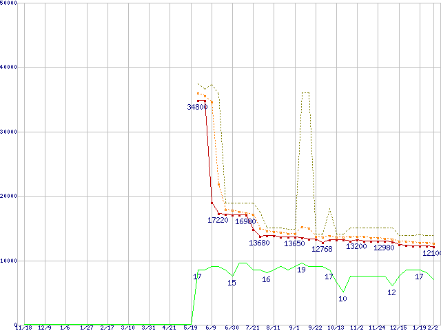※このグラフは過去のデータも税率5%相当に調整した税込み相当額のグラフです。 税率変更や、総額表示方式導入(2004年4月)の影響は除いています。 | | | ●凡例 | 最安値 (点線部は販売店未確認 または未調査) | 平均値 | 最高値 | ショップ数 |