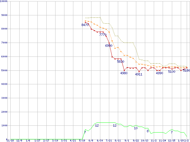 ※このグラフは過去のデータも税率5%相当に調整した税込み相当額のグラフです。 税率変更や、総額表示方式導入(2004年4月)の影響は除いています。 | | | ●凡例 | 最安値 (点線部は販売店未確認 または未調査) | 平均値 | 最高値 | ショップ数 |
