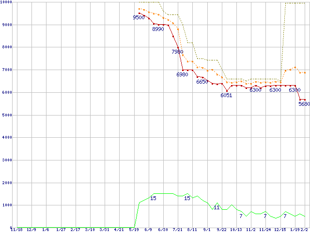 ※このグラフは過去のデータも税率5%相当に調整した税込み相当額のグラフです。 税率変更や、総額表示方式導入(2004年4月)の影響は除いています。 | | | ●凡例 | 最安値 (点線部は販売店未確認 または未調査) | 平均値 | 最高値 | ショップ数 |