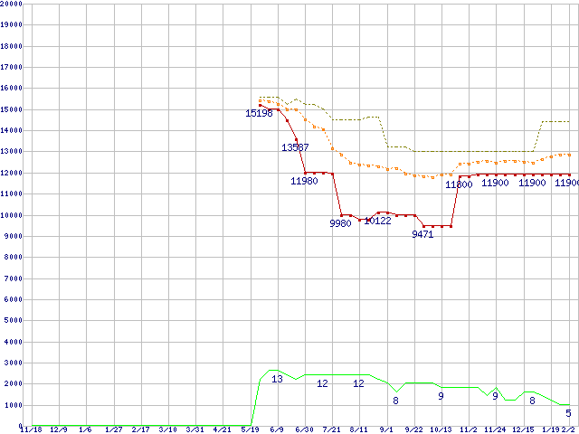 ※このグラフは過去のデータも税率5%相当に調整した税込み相当額のグラフです。 税率変更や、総額表示方式導入(2004年4月)の影響は除いています。 | | | ●凡例 | 最安値 (点線部は販売店未確認 または未調査) | 平均値 | 最高値 | ショップ数 |