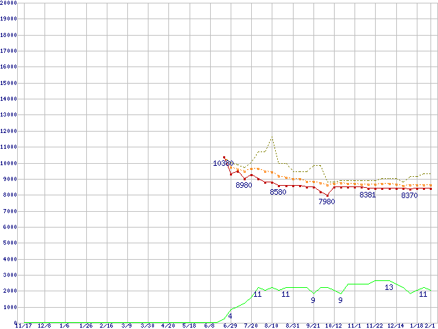 ※このグラフは過去のデータも税率5%相当に調整した税込み相当額のグラフです。 税率変更や、総額表示方式導入(2004年4月)の影響は除いています。 | | | ●凡例 | 最安値 (点線部は販売店未確認 または未調査) | 平均値 | 最高値 | ショップ数 |
