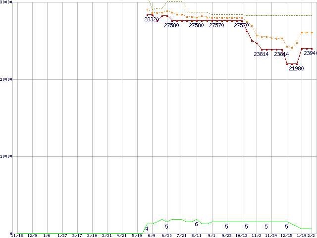 ※このグラフは過去のデータも税率5%相当に調整した税込み相当額のグラフです。 税率変更や、総額表示方式導入(2004年4月)の影響は除いています。 | | | ●凡例 | 最安値 (点線部は販売店未確認 または未調査) | 平均値 | 最高値 | ショップ数 |