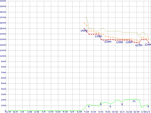 ※このグラフは過去のデータも税率5%相当に調整した税込み相当額のグラフです。 税率変更や、総額表示方式導入(2004年4月)の影響は除いています。 | | | ●凡例 | 最安値 (点線部は販売店未確認 または未調査) | 平均値 | 最高値 | ショップ数 |