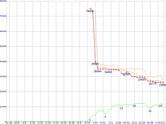 ※このグラフは過去のデータも税率5%相当に調整した税込み相当額のグラフです。 税率変更や、総額表示方式導入(2004年4月)の影響は除いています。 | | | ●凡例 | 最安値 (点線部は販売店未確認 または未調査) | 平均値 | 最高値 | ショップ数 |