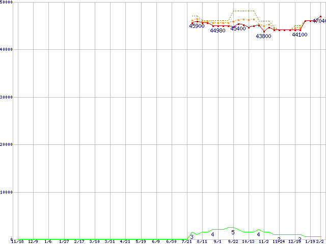 ※このグラフは過去のデータも税率5%相当に調整した税込み相当額のグラフです。 税率変更や、総額表示方式導入(2004年4月)の影響は除いています。 | | | ●凡例 | 最安値 (点線部は販売店未確認 または未調査) | 平均値 | 最高値 | ショップ数 |