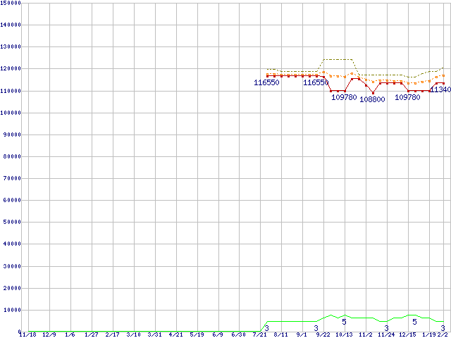 ※このグラフは過去のデータも税率5%相当に調整した税込み相当額のグラフです。 税率変更や、総額表示方式導入(2004年4月)の影響は除いています。 | | | ●凡例 | 最安値 (点線部は販売店未確認 または未調査) | 平均値 | 最高値 | ショップ数 |
