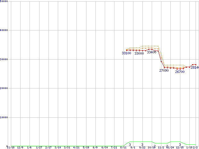 ※このグラフは過去のデータも税率5%相当に調整した税込み相当額のグラフです。 税率変更や、総額表示方式導入(2004年4月)の影響は除いています。 | | | ●凡例 | 最安値 (点線部は販売店未確認 または未調査) | 平均値 | 最高値 | ショップ数 |