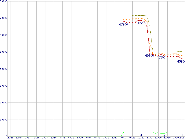 ※このグラフは過去のデータも税率5%相当に調整した税込み相当額のグラフです。 税率変更や、総額表示方式導入(2004年4月)の影響は除いています。 | | | ●凡例 | 最安値 (点線部は販売店未確認 または未調査) | 平均値 | 最高値 | ショップ数 |