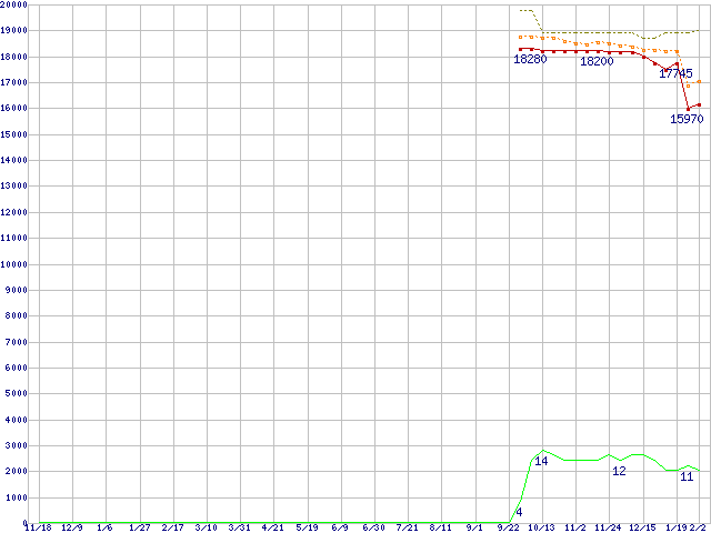 ※このグラフは過去のデータも税率5%相当に調整した税込み相当額のグラフです。 税率変更や、総額表示方式導入(2004年4月)の影響は除いています。 | | | ●凡例 | 最安値 (点線部は販売店未確認 または未調査) | 平均値 | 最高値 | ショップ数 |
