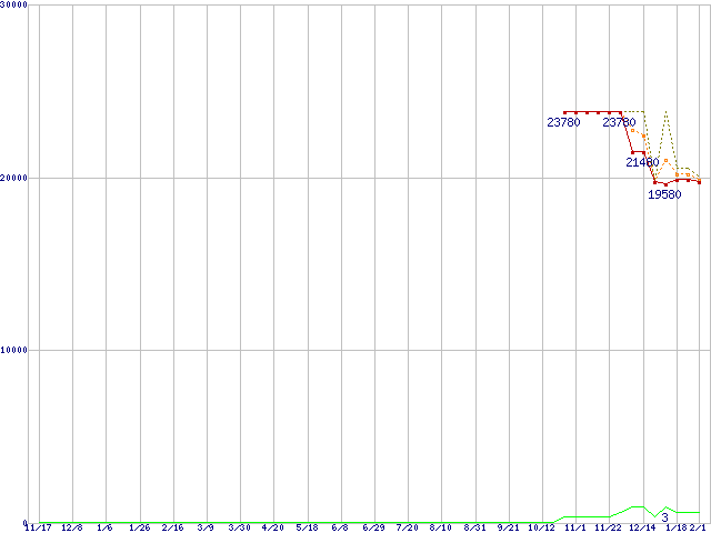 ※このグラフは過去のデータも税率5%相当に調整した税込み相当額のグラフです。 税率変更や、総額表示方式導入(2004年4月)の影響は除いています。 | | | ●凡例 | 最安値 (点線部は販売店未確認 または未調査) | 平均値 | 最高値 | ショップ数 |