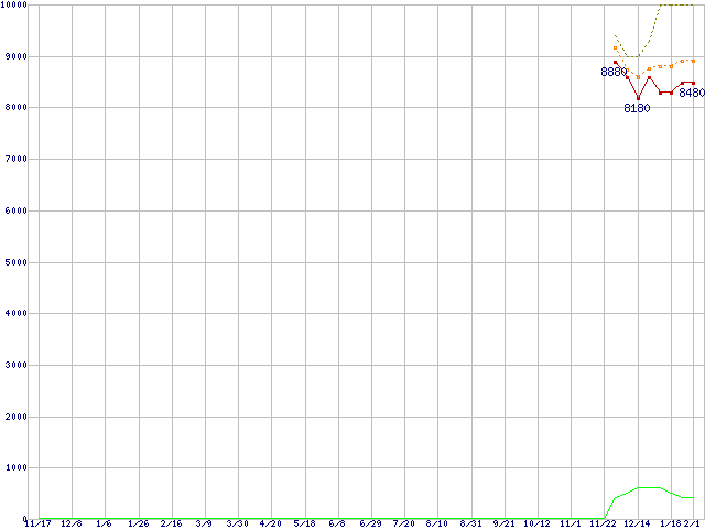 ※このグラフは過去のデータも税率5%相当に調整した税込み相当額のグラフです。 税率変更や、総額表示方式導入(2004年4月)の影響は除いています。 | | | ●凡例 | 最安値 (点線部は販売店未確認 または未調査) | 平均値 | 最高値 | ショップ数 |