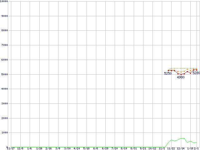 ※このグラフは過去のデータも税率5%相当に調整した税込み相当額のグラフです。 税率変更や、総額表示方式導入(2004年4月)の影響は除いています。 | | | ●凡例 | 最安値 (点線部は販売店未確認 または未調査) | 平均値 | 最高値 | ショップ数 |