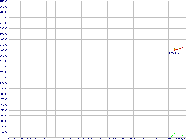 ※このグラフは過去のデータも税率5%相当に調整した税込み相当額のグラフです。 税率変更や、総額表示方式導入(2004年4月)の影響は除いています。 | | | ●凡例 | 最安値 (点線部は販売店未確認 または未調査) | 平均値 | 最高値 | ショップ数 |