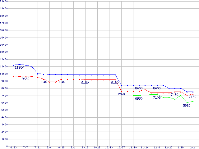 Core Duo向けSocket 478 (FSB 533MHz,L2 1MB,EM64T対応)の最安値推移