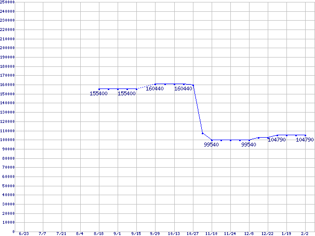 | Socket F (FSB 1000MHz,L2 1MBx2,Dual Core,TDP 120W)の最安値推移 | | | (2006年6月23日~2007年2月2日) |