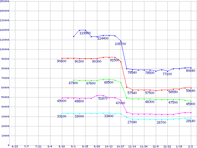 | Socket F (FSB 1000MHz,L2 1MBx2,Dual Core,TDP 95W)の最安値推移 | | | (2006年6月23日~2007年2月2日) |