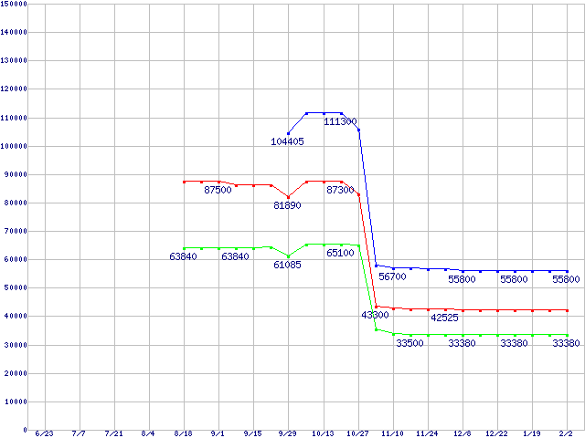 | Socket AM2 (FSB 1000MHz,L2 1MBx2,Dual Core,TDP 103W)の最安値推移 | | | (2006年6月23日~2007年2月2日) |