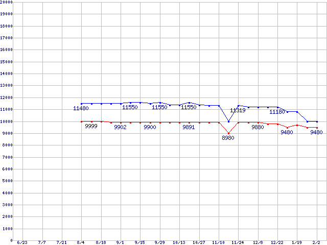 | LGA775 (FSB 800MHz,L2 1MB,Hyper-Threading,EM64T対応)の最安値推移 | | | (2006年6月23日~2007年2月2日) |