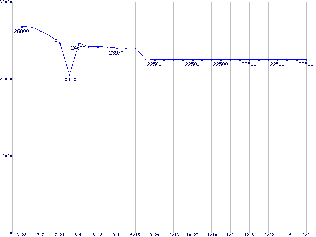 | LGA775 (FSB 800MHz,L2 2MB×2,Dual Core,EM64T・VT対応)の最安値推移 | | | (2006年6月23日~2007年2月2日) |