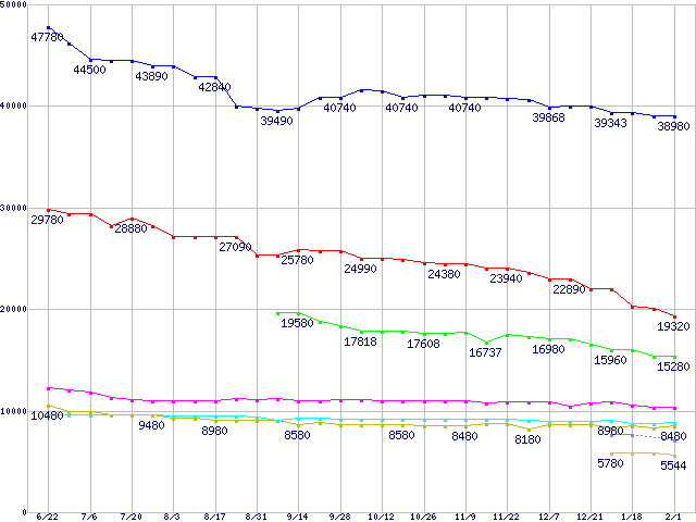 | Barracuda 7200.10 (7200rpm,Serial ATA II/3Gbps)の最安値推移 | | | (2006年6月22日~2007年2月1日) |