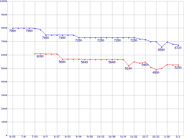 | Barracuda 7200.9 (7200rpm,Serial ATA II/3Gbps,Low Profile)の最安値推移 | | | (2006年6月22日~2007年2月1日) |