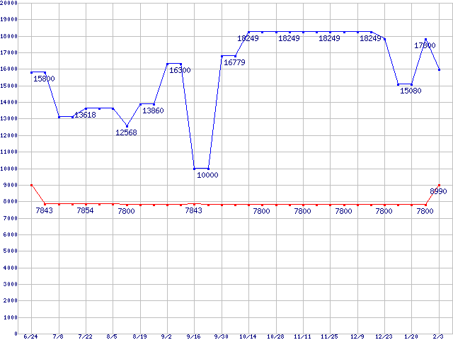 | PC3200(DDR400) DDR SDRAM DIMM ECC対応 Registeredタイプの最安値推移 | | | (2006年6月24日~2007年2月3日) |