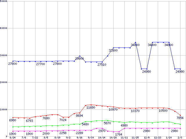 PC2-4200*(DDR2-533) DDR2 SDRAM DIMMの最安値推移