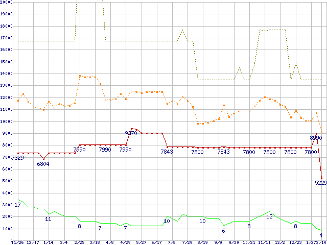 ※このグラフは過去のデータも税率5%相当に調整した税込み相当額のグラフです。 税率変更や、総額表示方式導入(2004年4月)の影響は除いています。 | | | ●凡例 | 最安値 (点線部は販売店未確認 または未調査) | 平均値 | 最高値 | ショップ数 |