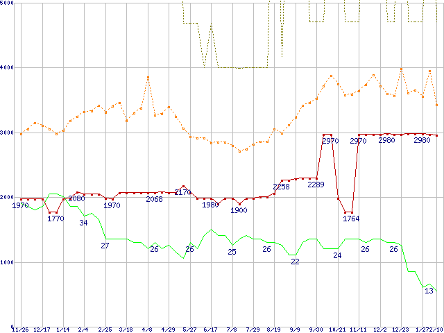 ※このグラフは過去のデータも税率5%相当に調整した税込み相当額のグラフです。 税率変更や、総額表示方式導入(2004年4月)の影響は除いています。 | | | ●凡例 | 最安値 (点線部は販売店未確認 または未調査) | 平均値 | 最高値 | ショップ数 |